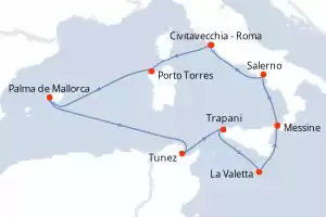 Italia, Túnez, España, Malta Itinerario: Civitavecchia - Roma , Porto Torres , Palma de Mallorca , Tunez , Trapani , La Valetta , Messine , Salerno , Civitavecchia - Roma Comidas incluidas Oceania Allura 10 días Camarote balcón Civitavecchia - Roma 31/01/2028 desde US$3506 EL PRECIO NO INCLUYE LA PERCEPCIÓN DEL 30% DE AFIP - RG 5463 TARIFA NO REEMBOLSABLE Comidas incluidas Ver las ofertas