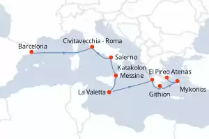 Italia, España, Grecia, Malta Itinerario: Barcelona , Civitavecchia - Roma , Salerno , Messine , La Valetta , Katakolon , Githion , Mykonos , El Pireo Atenas Comidas incluidas Oceania Allura 11 días Camarote balcón Barcelona 08/03/2028 desde US$4746 EL PRECIO NO INCLUYE LA PERCEPCIÓN DEL 30% DE AFIP - RG 5463 TARIFA NO REEMBOLSABLE Comidas incluidas Ver las ofertas