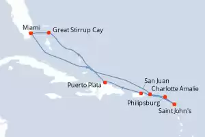 Estados Unidos, Bahamas, República Dominicana, Puerto Rico, Paises Bajos, Antigua y Barbuda, Reino Unido Itinerario: Miami , Charlotte Amalie , Saint John's , Philipsburg , San Juan , Puerto Plata , Great Stirrup Cay , Miami Comidas incluidas Oceania Marina 11 días Camarote estándar Miami 13/02/2027 desde US$3234 EL PRECIO NO INCLUYE LA PERCEPCIÓN DEL 30% DE AFIP - RG 5463 TARIFA NO REEMBOLSABLE Comidas incluidas Ver las ofertas