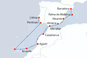 Portugal, España, Marruecos, Reino Unido Itinerario: Barcelona , Palma de Mallorca , Alicante , Almeria , Gibraltar , Casablanca , Agadir , Arrecife , Santa Cruz de la Palma , Portimao , Lisboa Comidas incluidas Oceania Nautica 12 días Camarote estándar Barcelona 15/08/2027 desde US$3671 EL PRECIO NO INCLUYE LA PERCEPCIÓN DEL 30% DE AFIP - RG 5463 TARIFA NO REEMBOLSABLE Comidas incluidas Ver las ofertas