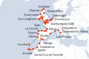Italia,Francia,España,Marruecos,Portugal,Bélgica,Paises Bajos,Reino Unido,Irlanda Itinerario: Civitavecchia - Roma , Cinqueterre , Saint Tropez , Barcelona , Malaga , Sevilla , Casablanca , Agadir , Arrecife , Santa Cruz de Tenerife , Santa Cruz de la Palma , Funchal , Lisboa , Oporto , La Coruña , Gijón , Bilbao , Biarritz , Burdeos , Burdeos , Burdeos , St. Malo , Puerto de San Pedro , Le Havre , Cherburgo , Dunkerque , Zeebrugge , Ijmuiden , Londres , Torbay , Southampton , Queensferry , Scrabster , Ullapool , Greencastle , Dun Laoghaire , Holyhead , Fishguard , Waterford , Cork , Portland , Southampton Comidas incluidas Oceania Marina 46 días Camarote balcón Civitavecchia - Roma 28/04/2026 desde US$25884 EL PRECIO NO INCLUYE LA PERCEPCIÓN DEL 30% DE AFIP - RG 5463 TARIFA NO REEMBOLSABLE Comidas incluidas Ver las ofertas