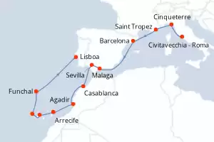 España, Marruecos, Francia, Italia, Portugal Itinerario: Civitavecchia - Roma , Cinqueterre , Saint Tropez , Barcelona , Malaga , Sevilla , Casablanca , Agadir , Arrecife , Santa Cruz de Tenerife , Santa Cruz de la Palma , Funchal , Lisboa Comidas incluidas Oceania Marina 15 días Camarote balcón Civitavecchia - Roma 28/04/2026 desde US$5088 EL PRECIO NO INCLUYE LA PERCEPCIÓN DEL 30% DE AFIP - RG 5463 TARIFA NO REEMBOLSABLE Comidas incluidas Ver las ofertas