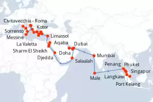 Grecia, Malasia, Turquía, Tailandia, Sri Lanka, India, Maldivas, Emiratos Árabes Unidos, Qatar, Montenegro, Croacia, Malta, Oman, Italia, Arabia Saudí, Egipto, Singapur, Jordania, Chipre Itinerario: Civitavecchia - Roma , Sorrento , Messine , La Valetta , Dubrovnik , Kotor , Corfú , Katakolon , Santoríni , El Pireo Atenas , Efeso , Bodrum , Heraklion , Rodas , Limassol , Aqaba , Sharm El Sheikh , Safaga , Djedda , Salaalah , Dubai , Abu Dhabi , Doha , Dubai , Mumbai , Mumbai , Male , Male , , Phuket , Langkawi , Penang , Port Kelang , Singapur , Singapur Comidas incluidas Oceania Nautica 53 días Camarote estándar Civitavecchia - Roma 13/09/2026 desde US$18019 EL PRECIO NO INCLUYE LA PERCEPCIÓN DEL 30% DE AFIP - RG 5463 TARIFA NO REEMBOLSABLE Comidas incluidas Ver las ofertas