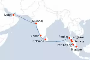 Malasia, Singapur, Emiratos Árabes Unidos, India, Sri Lanka, Tailandia Itinerario: Singapur , Port Kelang , Penang , Langkawi , Phuket , , Colombo , Cochin , Mangalore , Goa , Mumbai , Al Fujairah , Dubai Comidas incluidas Oceania Nautica 19 días Camarote estándar Singapur 08/05/2027 desde US$6217 EL PRECIO NO INCLUYE LA PERCEPCIÓN DEL 30% DE AFIP - RG 5463 TARIFA NO REEMBOLSABLE Comidas incluidas Ver las ofertas