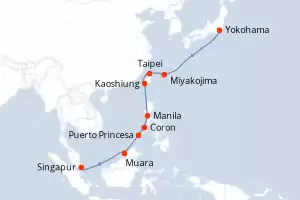Singapur, Brunei, Filipinas, Taiwán, Japón Itinerario: Yokohama , Yokohama , Miyakojima , Taipei , Kaoshiung , Manila , Coron , Puerto Princesa , Muara , Singapur , Singapur Comidas incluidas Oceania Vista 16 días Camarote balcón Yokohama 11/04/2027 desde US$7769 EL PRECIO NO INCLUYE LA PERCEPCIÓN DEL 30% DE AFIP - RG 5463 TARIFA NO REEMBOLSABLE Comidas incluidas Ver las ofertas
