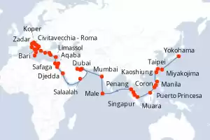 Emiratos Árabes Unidos, Italia, Singapur, India, Brunei, Grecia, Malta, Turquía, Maldivas, Croacia, Chipre, Egipto, Filipinas, Eslovenia, Jordania, Taiwán, Arabia Saudí, Sri Lanka, Oman, Tailandia, Ja Itinerario: Yokohama , Yokohama , Miyakojima , Taipei , Kaoshiung , Manila , Coron , Puerto Princesa , Muara , Singapur , Singapur , Port Kelang , Penang , Phuket , , Male , Mumbai , Mumbai , Dubai , Abu Dhabi , Doha , Dubai , Salaalah , Djedda , Safaga , Safaga , Aqaba , Sharm El Sheikh , Sokhna , Limassol , Rodas , Efeso , El Pireo Atenas , Igoumenitsa , Bari , Zadar , Koper , Ravenna , Split , Dubrovnik , La Valetta , Messine , Sorrento , Civitavecchia - Roma Comidas incluidas Oceania Vista 66 días Camarote balcón Yokohama 11/04/2027 desde US$34410 EL PRECIO NO INCLUYE LA PERCEPCIÓN DEL 30% DE AFIP - RG 5463 TARIFA NO REEMBOLSABLE Comidas incluidas Ver las ofertas