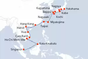 Japón,Taiwán,China,Vietnam,Malasia,Singapur Itinerario: Yokohama , Nagoya , Kobe , Kochi , Beppu , Kagoshima , Nagasaki , Miyakojima , Taipei , Hong Kong , Hanoï , Hue , Hue , Cam Ranh , Ho Chi Minh-Ville , Kota Kinabalu , Singapur Comidas incluidas Oceania Riviera 21 días Camarote estándar Yokohama 05/11/2027 desde US$8088 EL PRECIO NO INCLUYE LA PERCEPCIÓN DEL 30% DE AFIP - RG 5463 TARIFA NO REEMBOLSABLE Comidas incluidas Ver las ofertas