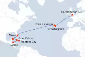Estados Unidos,Islas Caimán,Jamaica,Honduras,México,Portugal,Reino Unido Itinerario: Miami , Gran Caiman , Montego Bay , Roatan , Costa Maya , Cozumel , Miami , Praia da vitoria , Punta Delgada , Southampton Comidas incluidas Queen Elizabeth 22 días Camarote estándar Miami 29/12/2026 desde US$3691 EL PRECIO NO INCLUYE LA PERCEPCIÓN DEL 30% DE AFIP - RG 5463 TARIFA NO REEMBOLSABLE Comidas incluidas Ver las ofertas