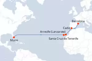 España,Estados Unidos Itinerario: Barcelona , Cadiz , Arrecife (Lanzarote) , Santa Cruz de Tenerife , Miami Comidas incluidas Queen Elizabeth 14 días Camarote estándar Barcelona 29/10/2027 desde US$3094 EL PRECIO NO INCLUYE LA PERCEPCIÓN DEL 30% DE AFIP - RG 5463 TARIFA NO REEMBOLSABLE Comidas incluidas Ver las ofertas