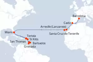 España,Estados Unidos,Antigua y Barbuda,Grenada,Barbados,Santa Lucia,Paises Bajos,Reino Unido Itinerario: Barcelona , Cadiz , Arrecife (Lanzarote) , Santa Cruz de Tenerife , Miami , San Thomas , St Kitts , Grenada , Barbados , Santa Lucia , Saint Martin (Antilles Néerlandaises) , Tortola , Miami Comidas incluidas Queen Elizabeth 28 días Camarote estándar Barcelona 29/10/2027 desde US$5124 EL PRECIO NO INCLUYE LA PERCEPCIÓN DEL 30% DE AFIP - RG 5463 TARIFA NO REEMBOLSABLE Comidas incluidas Ver las ofertas