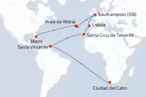 Estados Unidos,Reino Unido,Portugal,España,San Vincent y las Granadinas,Sudafrica Itinerario: Miami , Praia da vitoria , Punta Delgada , Southampton , Lisboa , Santa Cruz de Tenerife , Santo Vincente , Ciudad del Cabo , Ciudad del Cabo Comidas incluidas Queen Elizabeth 31 días Camarote estándar Miami 06/01/2028 desde US$5961 EL PRECIO NO INCLUYE LA PERCEPCIÓN DEL 30% DE AFIP - RG 5463 TARIFA NO REEMBOLSABLE Comidas incluidas Ver las ofertas