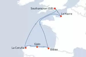 Reino Unido,España,Francia Itinerario: Southampton , La Coruña , Gijón , Bilbao , Le Havre , Southampton Comidas incluidas Queen Elizabeth 8 días Camarote estándar Southampton 21/02/2027 desde US$1302 EL PRECIO NO INCLUYE LA PERCEPCIÓN DEL 30% DE AFIP - RG 5463 TARIFA NO REEMBOLSABLE Comidas incluidas Ver las ofertas