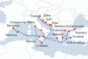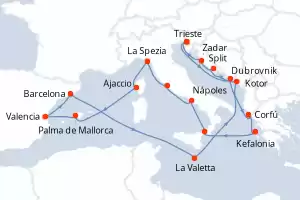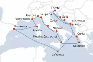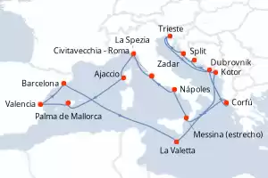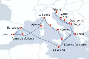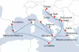 Francia,Grecia,Montenegro,Croacia,Italia,Malta,España Itinerario: Barcelona , Palma de Mallorca , Ajaccio , Messina (estrecho) , Messine , Salerno , Civitavecchia - Roma , Messina (estrecho) , Kefalonia , Corfú , Kotor , Split , Trieste , Zadar , Dubrovnik , La Valetta , Palma de Mallorca , Barcelona Comidas incluidas Queen Victoria 22 días Camarote estándar Barcelona 25/05/2026 desde US$3495 EL PRECIO NO INCLUYE LA PERCEPCIÓN DEL 30% DE AFIP - RG 5463 TARIFA NO REEMBOLSABLE Comidas incluidas Ver las ofertas