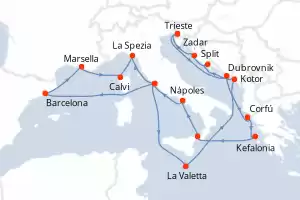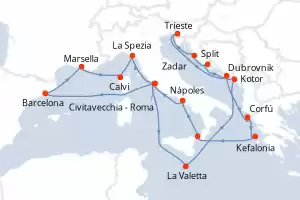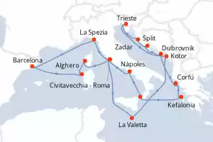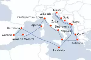 Croacia, Montenegro, Malta, Italia, Francia, España, Grecia Itinerario: Civitavecchia - Roma , Barcelona , Marsella , Calvi , La Spezia , Civitavecchia - Roma , La Valetta , Kotor , Split , Zadar , Trieste , Dubrovnik , Corfú , Kefalonia , Messina (estrecho) , Nápoles , Civitavecchia - Roma Comidas incluidas Queen Elizabeth 22 días Camarote estándar Civitavecchia - Roma 02/07/2027 desde US$4369 EL PRECIO NO INCLUYE LA PERCEPCIÓN DEL 30% DE AFIP - RG 5463 TARIFA NO REEMBOLSABLE Comidas incluidas Otros puertos de embarque : Trieste Ver las ofertas
