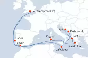 Italia, Portugal, Reino Unido, España, Malta, Croacia, Grecia Itinerario: Southampton , Lisboa , Cagliari , Katakolon , Corfú , Dubrovnik , Split , La Valetta , Cadiz , Southampton Comidas incluidas Queen Victoria 20 días Camarote estándar Southampton 05/09/2027 desde US$4381 EL PRECIO NO INCLUYE LA PERCEPCIÓN DEL 30% DE AFIP - RG 5463 TARIFA NO REEMBOLSABLE Comidas incluidas Ver las ofertas