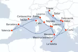 Italia, Francia, España, Grecia, Croacia, Montenegro, Malta Itinerario: Civitavecchia - Roma , La Valetta , Kotor , Split , Zadar , Trieste , Dubrovnik , Corfú , Kefalonia , Messina (estrecho) , Nápoles , Civitavecchia - Roma , Barcelona , Marsella , Calvi , La Spezia , Civitavecchia - Roma Comidas incluidas Queen Elizabeth 22 días Camarote estándar Civitavecchia - Roma 18/06/2027 desde US$4251 EL PRECIO NO INCLUYE LA PERCEPCIÓN DEL 30% DE AFIP - RG 5463 TARIFA NO REEMBOLSABLE Comidas incluidas Otros puertos de embarque : Trieste Ver las ofertas
