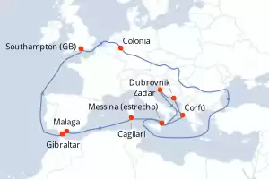 Croacia, Grecia, Italia, Alemania, Reino Unido, España Itinerario: Southampton , Colonia , Messina (estrecho) , Corfú , Dubrovnik , Zadar , Messina (estrecho) , Cagliari , Malaga , Gibraltar , Southampton Comidas incluidas Queen Anne 19 días Camarote estándar Southampton 11/05/2026 desde US$2563 EL PRECIO NO INCLUYE LA PERCEPCIÓN DEL 30% DE AFIP - RG 5463 TARIFA NO REEMBOLSABLE Comidas incluidas Ver las ofertas