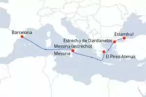 Grecia, España, Italia, Francia, Turquía Itinerario: Barcelona , Heraklion , Kusadasi , Estrecho de Dardanelos , Estambul , Estambul , Estrecho de Dardanelos , El Pireo Atenas , Mykonos , Katakolon , Messina (estrecho) , Barcelona , Toulon , Livorno , Menorca , Valencia , Barcelona Comidas incluidas Queen Victoria 22 días Camarote balcón Barcelona 04/05/2026 desde US$4455 EL PRECIO NO INCLUYE LA PERCEPCIÓN DEL 30% DE AFIP - RG 5463 TARIFA NO REEMBOLSABLE Comidas incluidas Ver las ofertas