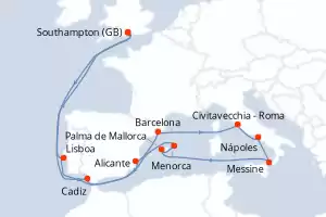 Reino Unido,Portugal,España,Italia Itinerario: Southampton , Lisboa , Alicante , Barcelona , Civitavecchia - Roma , Nápoles , Messine , Palma de Mallorca , Menorca , Cadiz , Southampton Comidas incluidas Queen Anne 19 días Camarote estándar Southampton 09/05/2027 desde US$3189 EL PRECIO NO INCLUYE LA PERCEPCIÓN DEL 30% DE AFIP - RG 5463 TARIFA NO REEMBOLSABLE Comidas incluidas Ver las ofertas