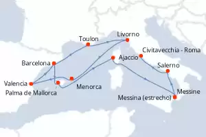 España, Italia, Francia Itinerario: Barcelona , Toulon , Livorno , Menorca , Valencia , Barcelona , Palma de Mallorca , Ajaccio , Messina (estrecho) , Messine , Salerno , Civitavecchia - Roma Comidas incluidas Queen Victoria 15 días Camarote estándar Barcelona 18/05/2026 desde US$2019 EL PRECIO NO INCLUYE LA PERCEPCIÓN DEL 30% DE AFIP - RG 5463 TARIFA NO REEMBOLSABLE Comidas incluidas Ver las ofertas