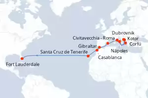 Estados Unidos, España, Marruecos, Italia, Reino Unido, Croacia, Montenegro, Grecia Itinerario: Civitavecchia - Roma , Corfú , Kotor , Dubrovnik , Nápoles , Civitavecchia - Roma , Palma de Mallorca , Gibraltar , Casablanca , Santa Cruz de Tenerife , Fort Lauderdale Comidas incluidas Enchanted Princess 23 días Camarote estándar Civitavecchia - Roma 13/11/2027 desde US$3080 EL PRECIO NO INCLUYE LA PERCEPCIÓN DEL 30% DE AFIP - RG 5463 TARIFA NO REEMBOLSABLE Comidas incluidas Ver las ofertas