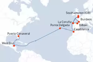Francia, Reino Unido, España, Marruecos, Portugal, Honduras, Estados Unidos Itinerario: Puerto Canaveral , West End , Punta Delgada , Casablanca , La Coruña , Southampton , La Coruña , Bilbao , Burdeos , Cherburgo , Southampton Comidas incluidas Sky Princess 23 días Camarote estándar Puerto Canaveral 07/03/2027 desde US$2510 EL PRECIO NO INCLUYE LA PERCEPCIÓN DEL 30% DE AFIP - RG 5463 TARIFA NO REEMBOLSABLE Comidas incluidas Ver las ofertas