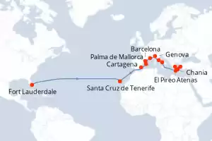 Mediterranean Grand Adventure Itinerario: Fort Lauderdale , Santa Cruz de Tenerife , Cartagena , Palma de Mallorca , Barcelona , Palma de Mallorca , Marsella , Ajaccio , Genova , La Spezia , La Spezia , Civitavecchia - Roma Comidas incluidas Sun Princess 22 días Camarote estándar Fort Lauderdale 28/03/2027 desde US$1989 EL PRECIO NO INCLUYE LA PERCEPCIÓN DEL 30% DE AFIP - RG 5463 TARIFA NO REEMBOLSABLE Comidas incluidas Ver las ofertas