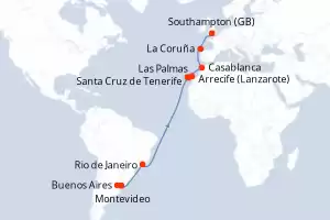 Pasaje Sudamericano Itinerario: Buenos Aires , Buenos Aires , Montevideo , Rio de Janeiro , Las Palmas , Arrecife (Lanzarote) , Santa Cruz de Tenerife , Casablanca , La Coruña , Southampton Comidas incluidas Majestic Princess 23 días Camarote estándar Buenos Aires 09/02/2027 desde US$1669 EL PRECIO NO INCLUYE LA PERCEPCIÓN DEL 30% DE AFIP - RG 5463 TARIFA NO REEMBOLSABLE Comidas incluidas salidas desde España Ver las ofertas