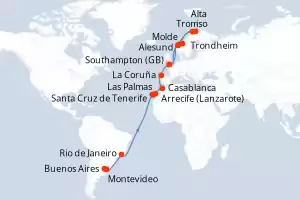 Gran Aventura de la Aurora Boreal Itinerario: Buenos Aires , Buenos Aires , Montevideo , Rio de Janeiro , Las Palmas , Arrecife (Lanzarote) , Santa Cruz de Tenerife , Casablanca , La Coruña , Southampton , Alesund , Trondheim , Tromso , Tromso , Alta , Molde , Southampton Comidas incluidas Majestic Princess 37 días Camarote estándar Buenos Aires 09/02/2027 desde US$3380 EL PRECIO NO INCLUYE LA PERCEPCIÓN DEL 30% DE AFIP - RG 5463 TARIFA NO REEMBOLSABLE Comidas incluidas salidas desde España Ver las ofertas