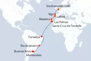 Pasaje Sudamericano Itinerario: Southampton , Vigo , Lisboa , Madeira , Las Palmas , Santa Cruz de Tenerife , Fortaleza , Rio de Janeiro , Montevideo , Buenos Aires , Buenos Aires Comidas incluidas Majestic Princess 23 días Camarote estándar Southampton 30/10/2027 desde US$2077 EL PRECIO NO INCLUYE LA PERCEPCIÓN DEL 30% DE AFIP - RG 5463 TARIFA NO REEMBOLSABLE Comidas incluidas Ver las ofertas