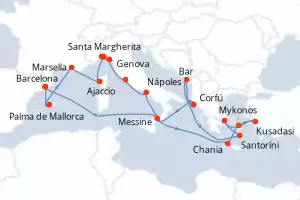 The Best of the Mediterranean Itinerario: Barcelona , Palma de Mallorca , Marsella , Ajaccio , Santa Margherita , Genova , La Spezia , Civitavecchia - Roma , Nápoles , Chania , Kusadasi , Mykonos , El Pireo Atenas , Santoríni , Bar , Corfú , Messine , Barcelona Comidas incluidas Sun Princess 22 días Camarote estándar Barcelona 16/05/2026 desde US$3555 EL PRECIO NO INCLUYE LA PERCEPCIÓN DEL 30% DE AFIP - RG 5463 TARIFA NO REEMBOLSABLE Comidas incluidas Otros puertos de embarque : El Pireo Atenas Civitavecchia - Roma Otras fechas : 18 jul. 26 Ver las ofertas