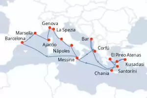 The Best of the Mediterranean Itinerario: El Pireo Atenas , Santoríni , Bar , Corfú , Messine , Barcelona , Palma de Mallorca , Marsella , Ajaccio , Genova , La Spezia , La Spezia , Civitavecchia - Roma , Nápoles , Chania , Kusadasi , Mykonos , El Pireo Atenas Comidas incluidas Sun Princess 22 días Camarote estándar El Pireo Atenas 30/05/2026 desde US$3492 EL PRECIO NO INCLUYE LA PERCEPCIÓN DEL 30% DE AFIP - RG 5463 TARIFA NO REEMBOLSABLE Comidas incluidas Otros puertos de embarque : Barcelona Civitavecchia - Roma Otras fechas : 28 mar. 26 20 jun. 26 22 ago. 26 Ver las ofertas
