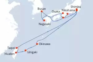 Japón, Taiwán, Corea del Sur Itinerario: Yokohama , Toba , Osaka , Nagasaki , Busan , Kochi , Shimizu , Yokohama , Taipei , Hualien , Ishigaki , Okinawa , Yokohama Comidas incluidas Diamond Princess 19 días Camarote estándar Yokohama 14/06/2027 desde US$3123 EL PRECIO NO INCLUYE LA PERCEPCIÓN DEL 30% DE AFIP - RG 5463 TARIFA NO REEMBOLSABLE Comidas incluidas Ver las ofertas