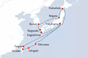 Taiwán, Japón, Corea del Sur Itinerario: Yokohama , Taipei , Hualien , Ishigaki , Okinawa , Yokohama , Hakodate , Niigita , Busan , Nagasaki , Kagoshima , Yokohama Comidas incluidas Diamond Princess 19 días Camarote estándar Yokohama 23/06/2027 desde US$2963 EL PRECIO NO INCLUYE LA PERCEPCIÓN DEL 30% DE AFIP - RG 5463 TARIFA NO REEMBOLSABLE Comidas incluidas Ver las ofertas