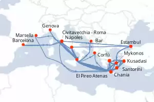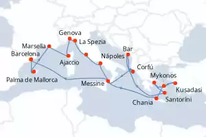 The Best of the Mediterranean Itinerario: Barcelona , Palma de Mallorca , Marsella , Ajaccio , Genova , La Spezia , La Spezia , Civitavecchia - Roma , Nápoles , Chania , Kusadasi , Mykonos , El Pireo Atenas , Santoríni , Bar , Corfú , Messine , Barcelona Comidas incluidas Sun Princess 22 días Camarote estándar Barcelona 27/06/2026 desde US$3438 EL PRECIO NO INCLUYE LA PERCEPCIÓN DEL 30% DE AFIP - RG 5463 TARIFA NO REEMBOLSABLE Comidas incluidas Otros puertos de embarque : El Pireo Atenas Civitavecchia - Roma Otras fechas : 4 abr. 26 6 jun. 26 29 ago. 26 Otras fechas Ver las ofertas