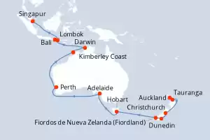 Australia, Nueva Zelanda e Indonesia Itinerario: Auckland , Tauranga , Christchurch , Dunedin , Fjordland , Hobart , Adelaide , Perth , Kimberley Coast , Darwin , Bali , Lombok , Singapur Comidas incluidas Coral Princess 29 días Camarote estándar Auckland 03/03/2027 desde US$4799 EL PRECIO NO INCLUYE LA PERCEPCIÓN DEL 30% DE AFIP - RG 5463 TARIFA NO REEMBOLSABLE Comidas incluidas Ver las ofertas