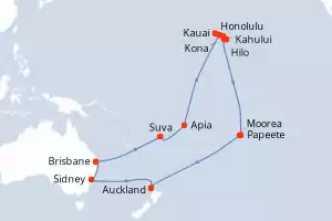 Tahití, Hawái y el Pacífico Sur Itinerario: Auckland , Sidney , Brisbane , Suva , Apia , Honolulu , Kauai , Kahului , Hilo , Kona , Papeete , Papeete , Moorea , Auckland Comidas incluidas Crown Princess 36 días Camarote estándar Auckland 29/08/2026 desde US$4777 EL PRECIO NO INCLUYE LA PERCEPCIÓN DEL 30% DE AFIP - RG 5463 TARIFA NO REEMBOLSABLE Comidas incluidas Otros puertos de embarque : Sidney Ver las ofertas