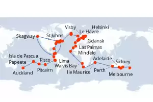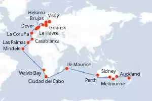 Nueva Zelanda,Australia,maurice,Sudafrica,Namibia,Cabo Verde,Marruecos,España,Francia,Bélgica,Polonia,Finlandia,Estonia,Suecia,Dinamarca,Paises Bajos,Reino Unido,Islandia,Canadá,Estados Unidos,Colombi Itinerario: Auckland , Sidney , Melbourne , Adelaide , Perth , Ile Maurice , Ciudad del Cabo , Ciudad del Cabo , Walvis Bay , Mindelo , Las Palmas , Casablanca , La Coruña , Le Havre , Brujas , Gdansk , Visby , Helsinki , Tallin , Estocolmo , Copenhague , Ijmuiden , Dover , Lerwick , Reykjavik , Grundarfjordur , Isafjordhur , St Johns , Corner Brook , Quebec , Quebec , Skagway , Charlottetown , Sidney , Halifax , Nueva York , Nueva York , Miami , Cartagena de Indias , Gatun , Manta , Lima , Lima , Pisco , Isla de Pascua , Pitcairn , Papeete , Moorea , Auckland Comidas incluidas Crown Princess 116 días Camarote estándar Auckland 06/05/2026 desde US$15447 EL PRECIO NO INCLUYE LA PERCEPCIÓN DEL 30% DE AFIP - RG 5463 TARIFA NO REEMBOLSABLE Comidas incluidas Otros puertos de embarque : Sidney Ver las ofertas