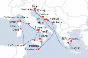 Malta, Grecia, Croacia, Italia, Eslovenia, Túnez, Francia, Montenegro Itinerario: El Pireo Atenas , Nafplio , Kotor , Korkula , Hvar , Vodice , Piran , Fusina , Rovinj , Vis , La Valetta , Naxos Di Giardini , Lipari , Sorrento , Civitavecchia - Roma , Bastia , Calvi , Olbia , La Goulette , Palermo , Amalfi , Civitavecchia - Roma Comidas incluidas Seabourn Ovation 25 días Suite El Pireo Atenas 05/06/2027 desde US$17712 EL PRECIO NO INCLUYE LA PERCEPCIÓN DEL 30% DE AFIP - RG 5463 TARIFA NO REEMBOLSABLE Comidas incluidas Ver las ofertas