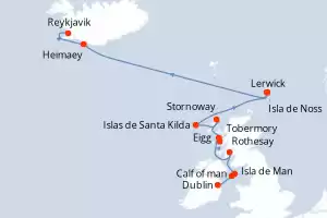 Reino Unido, Islandia, Irlanda Itinerario: Dublin , Calf of man , Isla de Man , Rothesay , Tobermory , Eigg , Stornoway , Islas de Santa Kilda , Lerwick , Isla de Noss , Heimaey , Reykjavik Comidas incluidas Seabourn Venture 11 días Suite Dublin 06/07/2026 desde US$12161 EL PRECIO NO INCLUYE LA PERCEPCIÓN DEL 30% DE AFIP - RG 5463 TARIFA NO REEMBOLSABLE Comidas incluidas Ver las ofertas