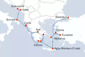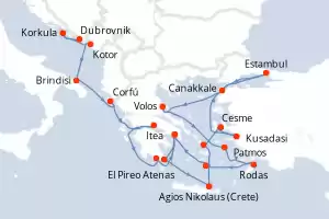 Montenegro,Croacia,Italia,Grecia,Turquía Itinerario: Dubrovnik , Kotor , Brindisi , Corfú , Itea , Githion , El Pireo Atenas , Monemvasia , Agios Nikolaus (Crete) , Mykonos , Cesme , Kusadasi , Estambul , Canakkale , Volos , Patmos , Rodas , Santoríni , El Pireo Atenas Comidas incluidas Seabourn Ovation 22 días Suite Dubrovnik 15/05/2027 desde US$17003 EL PRECIO NO INCLUYE LA PERCEPCIÓN DEL 30% DE AFIP - RG 5463 TARIFA NO REEMBOLSABLE Comidas incluidas Ver las ofertas