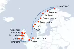 Noruega,Paises Bajos,Reino Unido,Irlanda Itinerario: Dover , Trondheim , Bronnoysund , Svolvaer , Tromso , Honningsvag , Loen , Bergen , Amsterdam , Dover , Portland , Cork , Fishguard , Isla de Man , Rothesay , Greenock , Belfast , Oban , Leith - Edimbourg , Newcastle (UK) , Dover Comidas incluidas Seabourn Ovation 29 días Suite Dover 13/06/2026 desde US$21254 EL PRECIO NO INCLUYE LA PERCEPCIÓN DEL 30% DE AFIP - RG 5463 TARIFA NO REEMBOLSABLE Comidas incluidas Ver las ofertas
