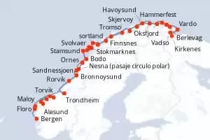 Noruega Itinerario: Bergen , Floro , Maloy , Torvik , Alesund , Molde , Kristiansund , Trondheim , Rorvik , Bronnoysund , Sandnessjoen , Nesna (pasaje círculo polar) , Ornes , Bodo , Stamsund , Svolvaer , Stokmarknes , sortland , Risoyhamn , Harstad , Finnsnes , Tromso , Skjervoy , Oksfjord , Hammerfest , Havoysund , Honningsvag , Kjollefjord , Mehamn , Berlevag , Batsfjord , Vardo , Vadso , Kirkenes , Vardo , Batsfjord , Berlevag , Mehamn , Kjollefjord , Honningsvag , Havoysund , Hammerfest , Oksfjord , Skjervoy , Tromso , Finnsnes , Harstad , Risoyhamn , sortland , Stokmarknes , Svolvaer , Stamsund , Bodo , Ornes , Nesna (pasaje círculo polar) , Sandnessjoen , Bronnoysund , Rorvik , Trondheim , Kristiansund , Molde , Alesund , Torvik , Maloy , Floro , Bergen Comidas incluidas MS Nordnorge 14 días Camarote estándar Bergen 02/02/2027 desde US$5193 EL PRECIO NO INCLUYE LA PERCEPCIÓN DEL 30% DE AFIP - RG 5463 TARIFA NO REEMBOLSABLE Comidas incluidas Ver las ofertas