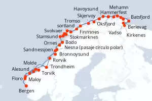 Noruega Itinerario: Bergen , Floro , Maloy , Torvik , Alesund , Hjorundfjorden , Alesund , Molde , Kristiansund , Trondheim , Rorvik , Bronnoysund , Sandnessjoen , Nesna (pasaje círculo polar) , Ornes , Bodo , Stamsund , Svolvaer , Stokmarknes , sortland , Risoyhamn , Harstad , Finnsnes , Tromso , Skjervoy , Oksfjord , Hammerfest , Havoysund , Honningsvag , Kjollefjord , Mehamn , Berlevag , Batsfjord , Vardo , Vadso , Kirkenes , Vardo , Batsfjord , Berlevag , Mehamn , Kjollefjord , Honningsvag , Havoysund , Hammerfest , Oksfjord , Skjervoy , Tromso , Finnsnes , Harstad , Risoyhamn , sortland , Stokmarknes , Svolvaer , Stamsund , Bodo , Ornes , Nesna (pasaje círculo polar) , Sandnessjoen , Bronnoysund , Rorvik , Trondheim , Kristiansund , Molde , Alesund , Torvik , Maloy , Floro , Bergen Comidas incluidas MS Kong Harald 16 días Camarote estándar Bergen 29/03/2027 desde US$3693 EL PRECIO NO INCLUYE LA PERCEPCIÓN DEL 30% DE AFIP - RG 5463 TARIFA NO REEMBOLSABLE Comidas incluidas Otras fechas : 31 mar. 26 14 mayo 26 1-12-23 sept. 26 Otras fechas Ver las ofertas