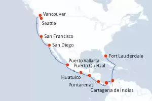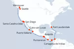 Salvador, Costa Rica, Panamá, Estados Unidos, Canadá, Colombia, México, Guatemala Itinerario: Fort Lauderdale , Cartagena de Indias , Canal panama (Enter) , Canal panama (Exit) , Puntarenas , Acajutla , Puerto Quetzal , Puerto Vallarta , Cabo san Lucas , San Diego , Santa Catalina (isla) , Vancouver , Seattle Comidas incluidas MS Eurodam 21 días Camarote estándar Fort Lauderdale 05/04/2026 desde US$2867 EL PRECIO NO INCLUYE LA PERCEPCIÓN DEL 30% DE AFIP - RG 5463 TARIFA NO REEMBOLSABLE Comidas incluidas Ver las ofertas