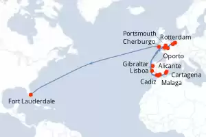 Reino Unido, Estados Unidos, Bélgica, España, Paises Bajos, Portugal, Francia Itinerario: Rotterdam , Lisboa , Lisboa , Cadiz , Malaga , Barcelona , Valencia , Cartagena , Gibraltar , Rotterdam , Zeebrugge , Cherburgo , Portsmouth , Falmouth , Fort Lauderdale Comidas incluidas Nieuw Statendam 30 días Camarote estándar Rotterdam 20/11/2027 desde US$3383 EL PRECIO NO INCLUYE LA PERCEPCIÓN DEL 30% DE AFIP - RG 5463 TARIFA NO REEMBOLSABLE Comidas incluidas Ver las ofertas