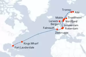 Noruega, Paises Bajos, Bélgica, Reino Unido, Estados Unidos Itinerario: Rotterdam , Nordfjord , Trondheim , Tromso , Tromso , Alta , Alta , Molde , Bergen , Lerwick , Amsterdam , Zeebrugge , Portland , Falmouth , Kings Wharf , Fort Lauderdale Comidas incluidas Rotterdam 28 días Camarote exterior Rotterdam 04/10/2026 desde US$5579 EL PRECIO NO INCLUYE LA PERCEPCIÓN DEL 30% DE AFIP - RG 5463 TARIFA NO REEMBOLSABLE Comidas incluidas Ver las ofertas