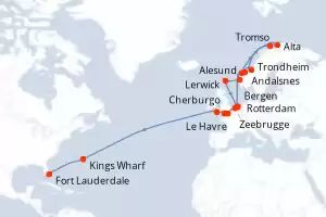 Noruega, Paises Bajos, Francia, Reino Unido, Estados Unidos, Bélgica Itinerario: Rotterdam , Alesund , Trondheim , Tromso , Tromso , Alta , Alta , Andalsnes , Bergen , Lerwick , Rotterdam , Zeebrugge , Le Havre , Cherburgo , Falmouth , Kings Wharf , Fort Lauderdale Comidas incluidas Rotterdam 29 días Camarote estándar Rotterdam 03/10/2027 desde US$4415 EL PRECIO NO INCLUYE LA PERCEPCIÓN DEL 30% DE AFIP - RG 5463 TARIFA NO REEMBOLSABLE Comidas incluidas Ver las ofertas
