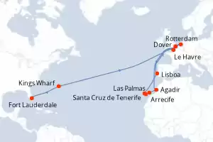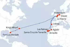 Portugal, Reino Unido, España, Estados Unidos, Marruecos, Francia, Paises Bajos Itinerario: Fort Lauderdale , Kings Wharf , Portland , Le Havre , Dover , Rotterdam , Agadir , Arrecife , Las Palmas , Santa Cruz de Tenerife , Lisboa , Dover Comidas incluidas Nieuw Statendam 27 días Camarote exterior Fort Lauderdale 04/04/2026 desde US$4559 EL PRECIO NO INCLUYE LA PERCEPCIÓN DEL 30% DE AFIP - RG 5463 TARIFA NO REEMBOLSABLE Comidas incluidas Ver las ofertas