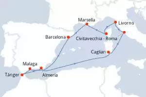 Italia, España, Marruecos, Francia Itinerario: Barcelona , Malaga , Tánger , Almeria , Cagliari , Civitavecchia - Roma , Livorno , Ajaccio , Marsella , Barcelona Comidas incluidas MS Oosterdam 12 días Camarote estándar Barcelona 25/05/2027 desde US$2387 EL PRECIO NO INCLUYE LA PERCEPCIÓN DEL 30% DE AFIP - RG 5463 TARIFA NO REEMBOLSABLE Comidas incluidas Ver las ofertas